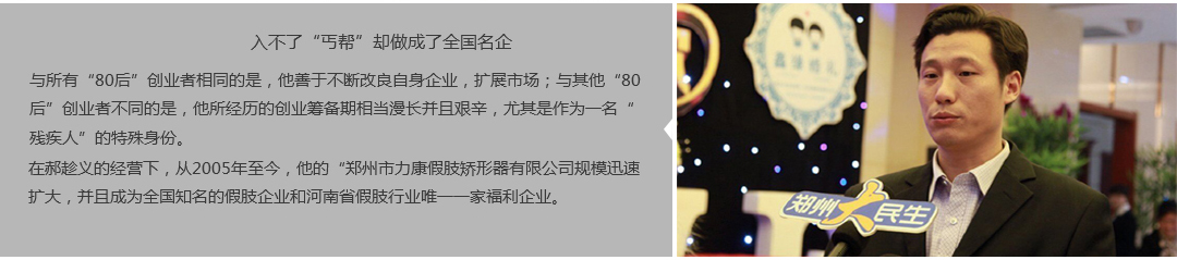 鄭州市力康假肢矯形器有限公司(簡稱力康),是一家專業(yè)從事假肢矯形器的設計、研發(fā)、制作及裝 配的專業(yè)機構。成立于1992年是河南省唯一一家福利企業(yè)。力康下設業(yè)務部、技術部、住院部、康復 部、售后服務部,并配有現(xiàn)代化的裝配車間和功能齊全的訓練大廳,為殘疾朋友康復訓練提供了可靠 保障。總經(jīng)理穿戴假肢多年,有著豐富的臨床經(jīng)驗和親身體會;多年來,力康已為全國幾十萬名殘疾 朋友安裝上舒適、美觀、耐用的假肢和矯形器具,使他們更大限度地恢復了正常的工作和生活。“產(chǎn) 品即人品”的質(zhì)量理念、先進的技術、實惠的價格、完善的售后服務是力康取勝的法寶……